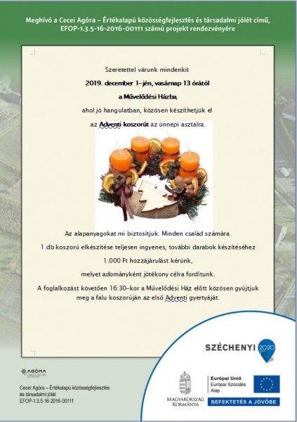 2019. december 1-jén, 13 órától adventi koszorú készítésére és gyertyagyújtásra várják az érdeklődőket a cecei Művelődési...