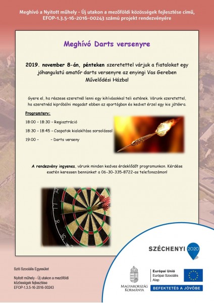 Várják a fiatalokat egy jó hangulatú, amatőr darts versenyre 2019. november 8-án, 18 órától a Vas Gereben Művelődési Házba...